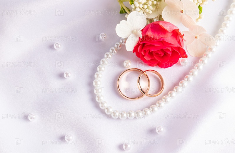 Красивая свадебная композиция с парой золотых обручальных колец на белом атласе, жемчужными бусинами, нежными цветами. вид сверху. открытка. приглашение