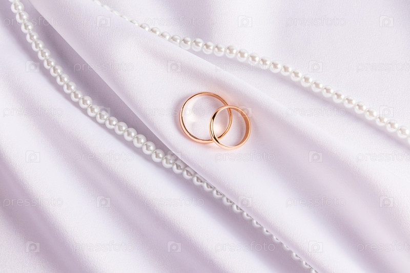 Два классических золотых обручальных кольца на белом атласном фоне с красивыми складками и ниткой жемчужных бус. Концепция свадебного дизайна. приглашение