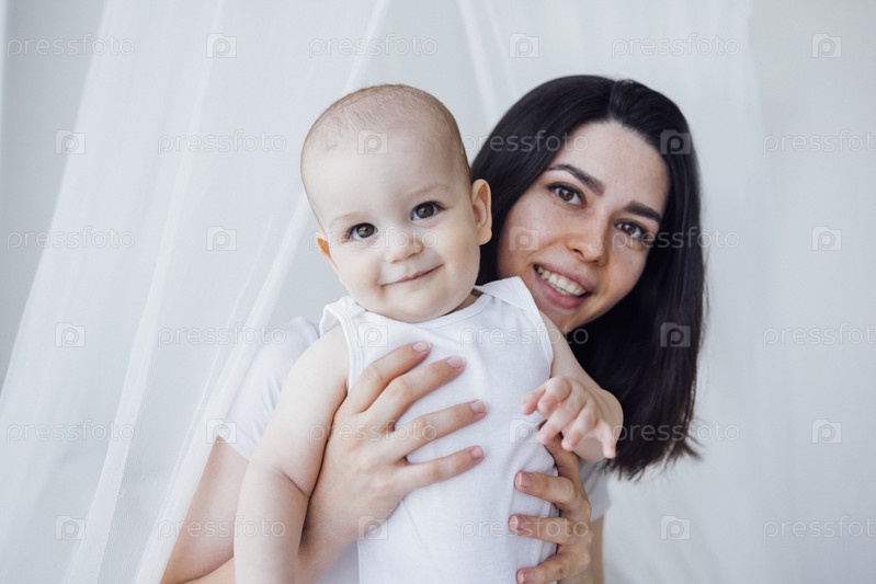 Симпатичный младенец в белом боди со своей мамой на светлом фоне. Концепция материнства