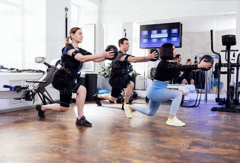 Спортивная пара в костюмах ems тренируется с личным тренером в тренажерном зале