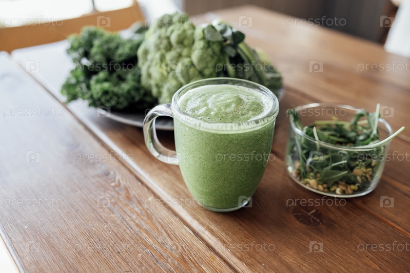Крупный план зеленого смузи из блендера в стеклянной чашке на кухонном столе