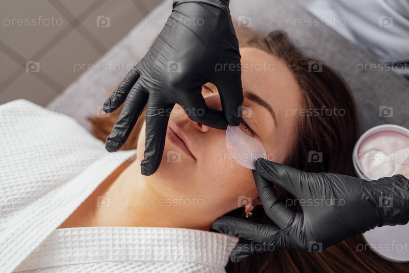 Процедуры в салоне красоты. Крупный план мастера, накладывающего силиконовые пластыри под глаза симпатичной клиентки-брюнетки. Кавказская молодая женщина получает профессиональный уход за кожей лица