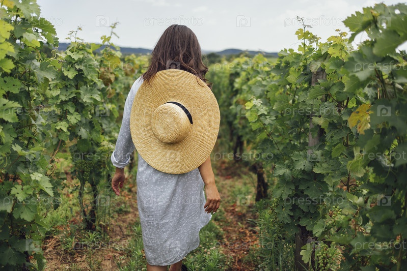 Привлекательная брюнетка в элегантном платье и солнцезащитных очках гуляет по винограднику