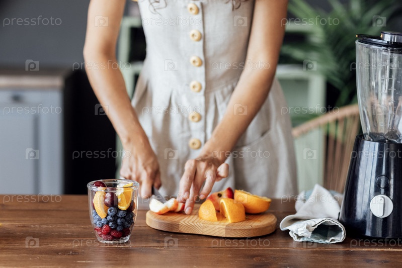 Крупный план стеклянной чаши с фруктами и ягодами и женских рук