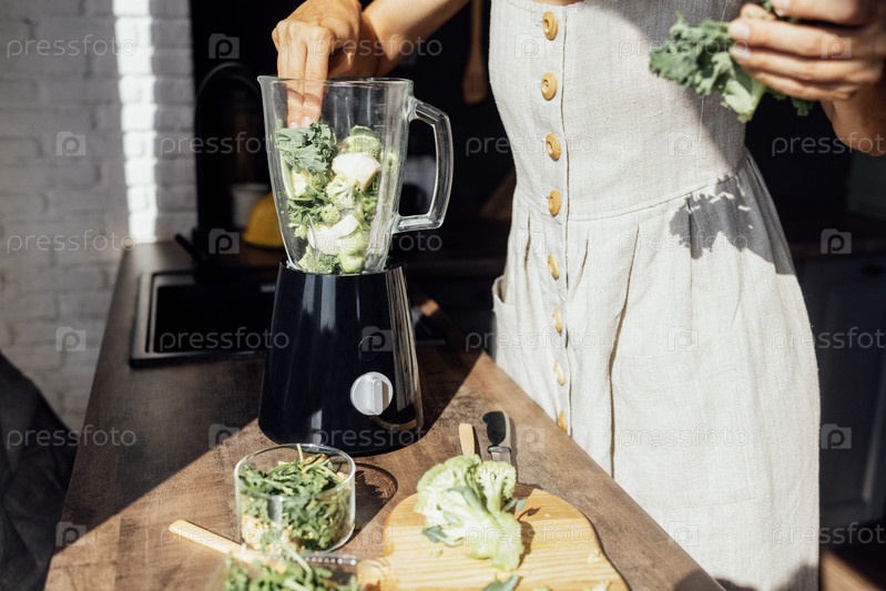 Крупный план молодых женских рук и блендера с зелеными травами и овощами. Девушка в льняном сарафане готовит богатый витаминами свежий коктейль