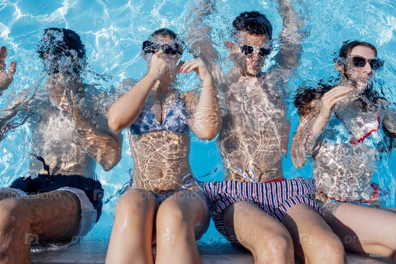 Симпатичные подростки в купальниках и солнцезащитных очках в бассейне. Улыбающиеся мальчики и девочки ныряют в прозрачную воду