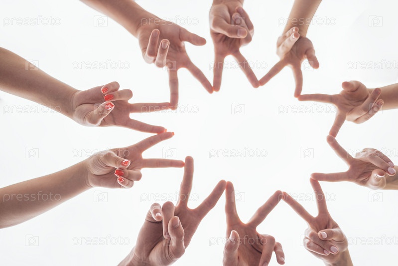 Мужчины и женщины пальцами рисуют звезду на белом фоне. Вид снизу. Руки людей с символом мира