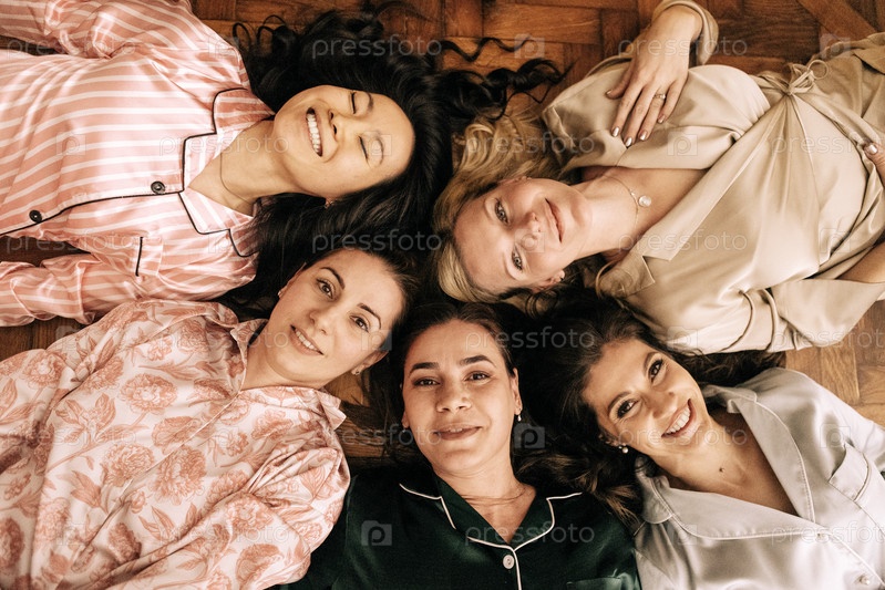 На полу лежат молодые улыбающиеся женщины в пижамах. Очаровательные многонациональные друзья на домашней вечеринке