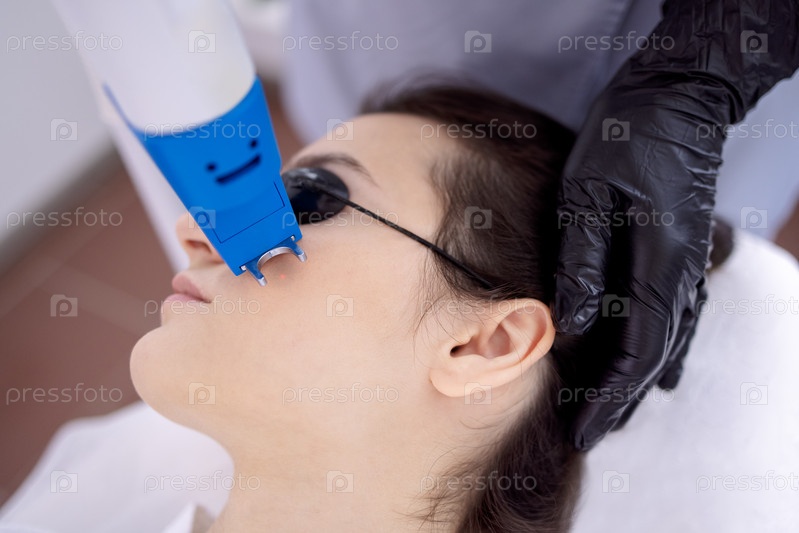 Крупный план женского лица в очках и устройства для удаления черных точек с кожи. Лечение пигментации, розацеа и постакне. Эстетическая косметология. Лазерная шлифовка кожи