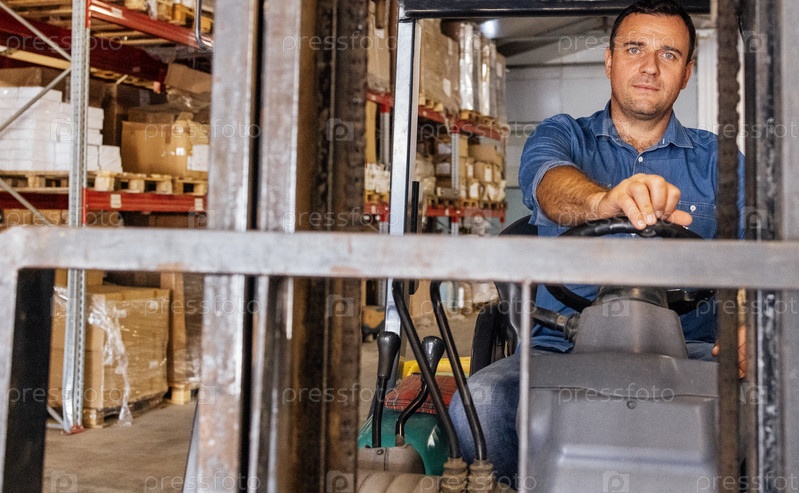 Молодой привлекательный водитель погрузчика на складе товаров. Красивый работник в повседневной одежде