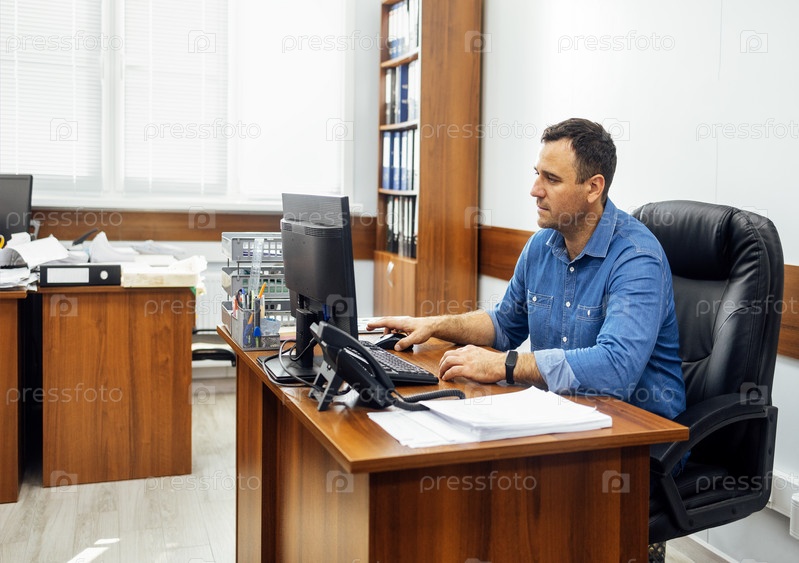 Молодой человек в джинсовой рубашке сидит за столом и работает за персональным компьютером в офисе. Работник выполняет свою работу на рабочем месте