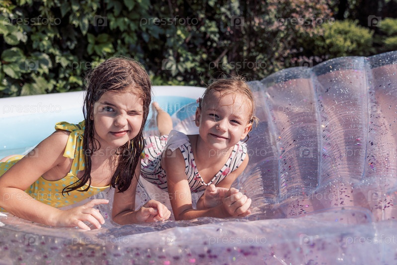 Две маленькие беззаботные девочки в купальниках на надувном матрасе. Милые друзья вместе веселятся в бассейне на террасе дома