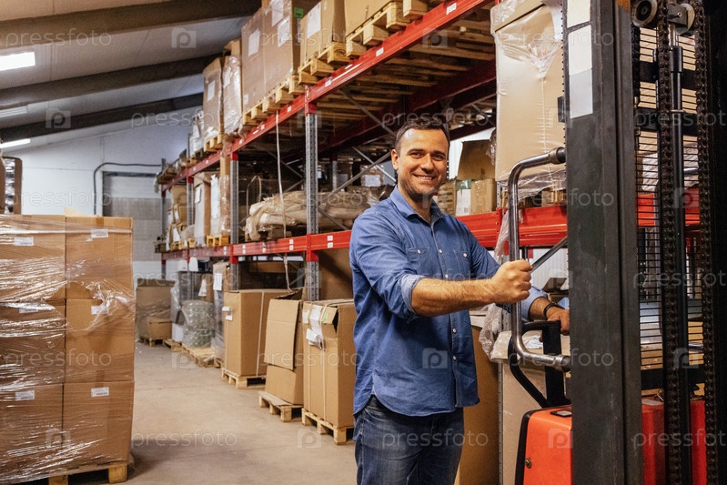 Молодой улыбающийся мужчина на складе с вилочным погрузчиком. Привлекательный рабочий в повседневной одежде возле самоходного грузового автомобиля