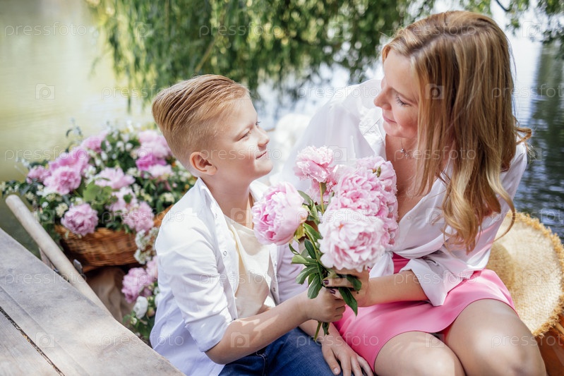 Милый мальчик и его привлекательная мать на деревянной лодке по пруду или озеру. Улыбающийся сын дарит своей блондинке-маме розовые пионы
