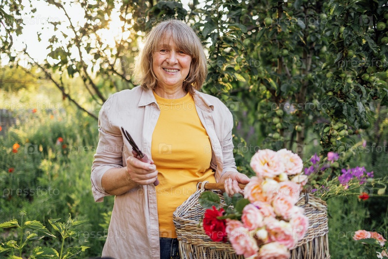 Улыбающаяся женщина средних лет срезает розы и кладет их в плетеную корзину. Счастливый пенсионер ухаживает за цветами в саду дома
