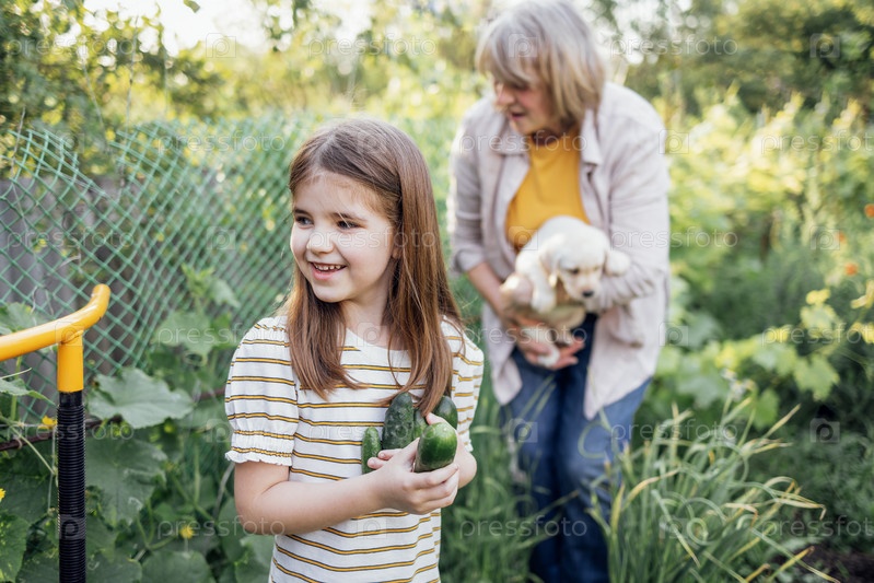 Маленькая девочка держит огурцы и смеется в саду. Зрелая женщина держит щенка лабрадора на улице. Милая внучка в гостях у бабушки