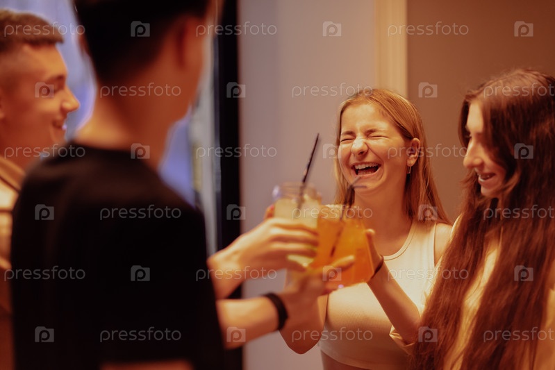 Радостные подростки поднимают тост с бокалами лимонада. Мальчики и девочки чокаются чашками с цитрусовым соком. Беззаботные друзья весело проводят время вместе дома