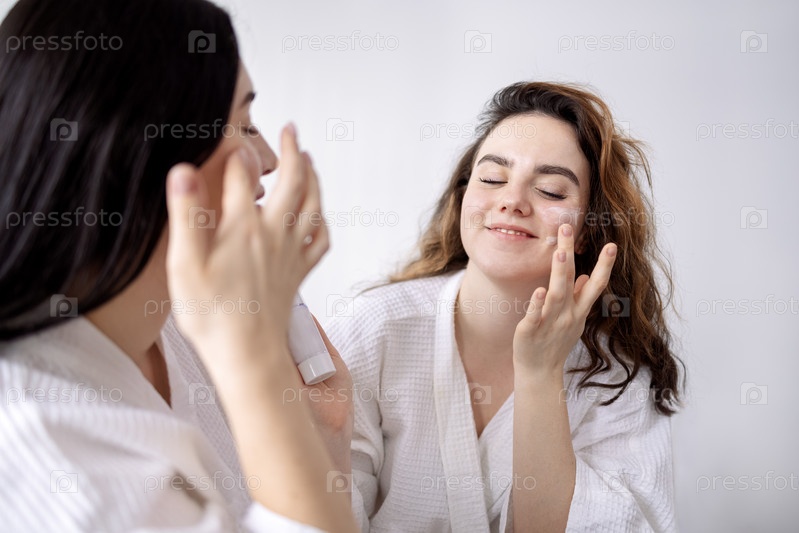 Молодые женщины в халатах наносят крем на лица в спа-салоне. Очаровательные друзья ухаживают за своей кожей в салоне красоты
