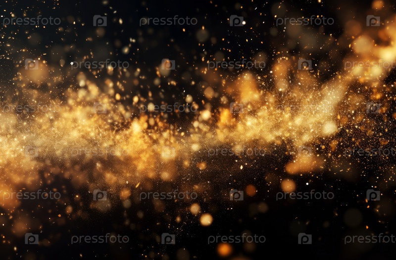 Абстрактный черный фон с золотыми блестками. Желтый блеск на темном фоне. Круглое блестящее боке