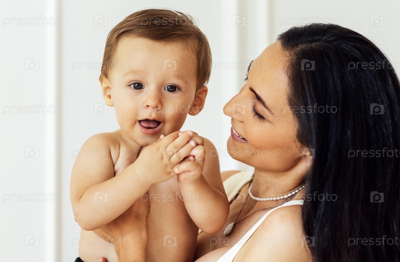 Молодая женщина держит на руках своего прекрасного ребенка. Очаровательная мама с милым милым малышом на фоне белой стены. Мать и ее маленький сын находятся дома. Концепция материнства и заботы