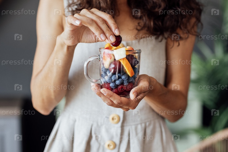 Крупный план стеклянной кружки с фруктами и ягодами в женских ухоженных руках. Молодая женщина в сарафане ест дома вишню