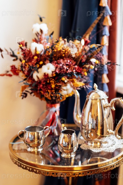 Красивый круглый стеклянный журнальный столик с металлическим чайником, молочником и чашкой. Осенний букет цветов с хлопком и элегантной посудой
