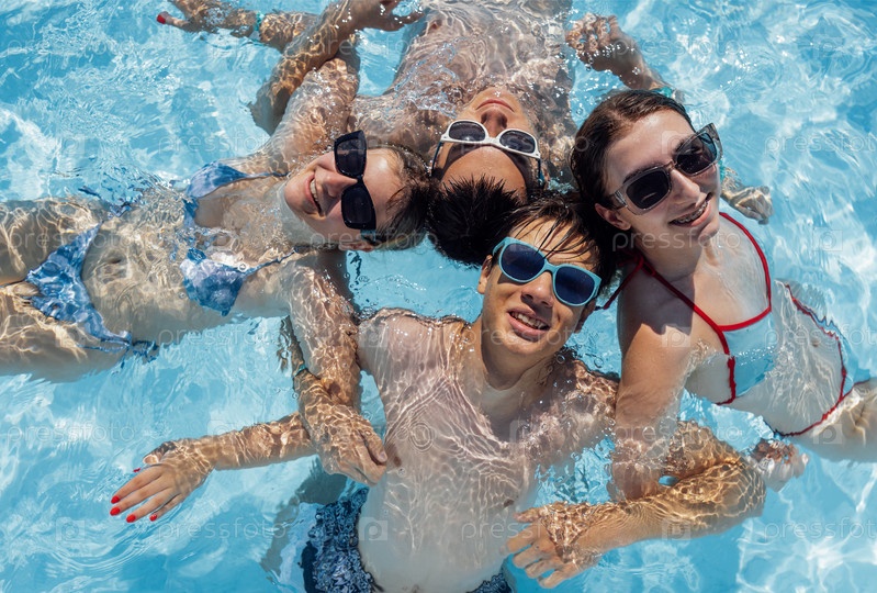 Улыбающиеся подростки в купальниках и солнцезащитных очках плавают в бассейне. Радостная компания друзей веселится в прозрачной воде. Милые мальчики и девочки вместе наслаждаются отдыхом