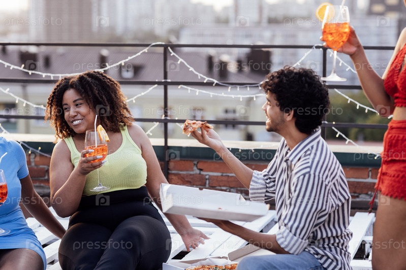 Четверо веселых друзей едят пиццу и наслаждаются вкусными коктейлями