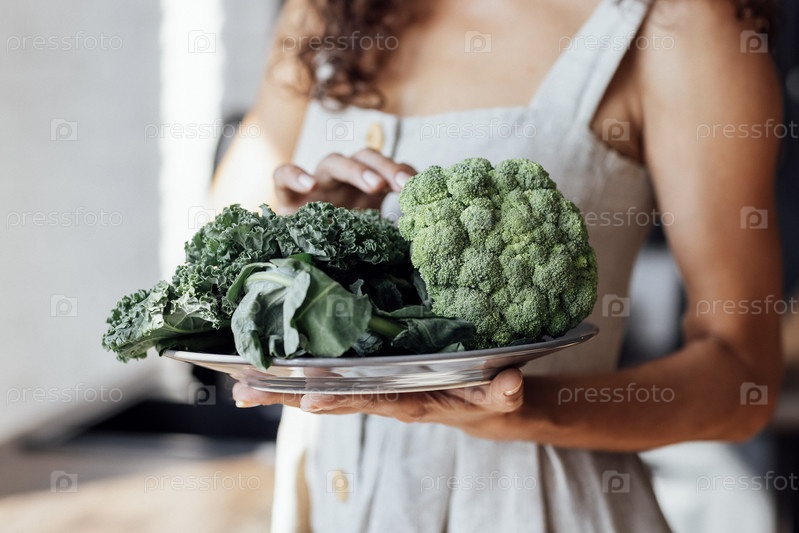 Крупный план подноса с волнистой капустой и брокколи. Молодая женщина в льняном сарафане держит свежие зеленые овощи