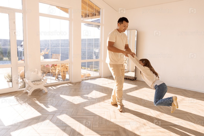 Азиатский молодой человек крутит на руках свою маленькую дочь