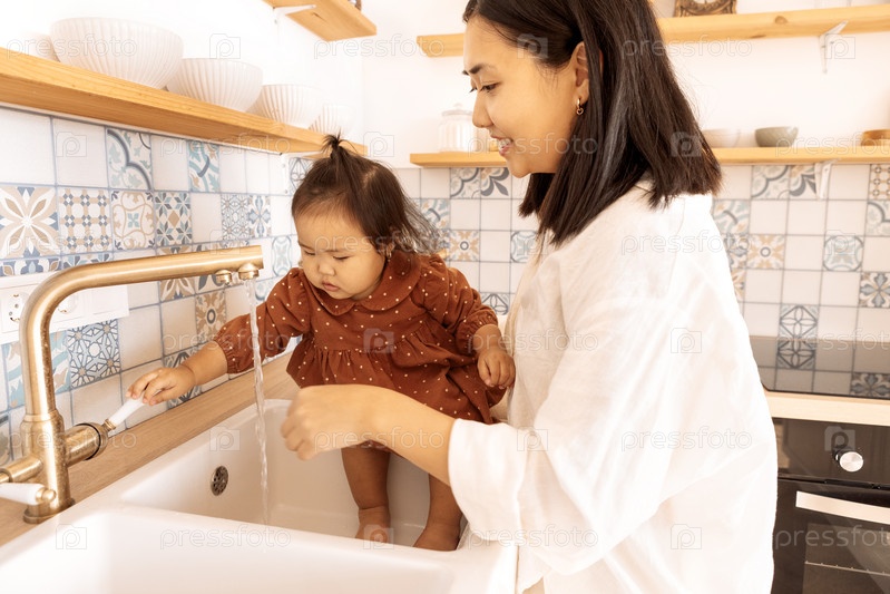Счастливая азиатская семья на кухне. Очаровательная кореянка и ее маленькая дочь моют руки в раковине