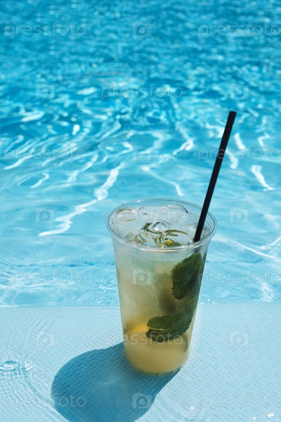 Вкусный ледяной напиток с лаймом, лимоном и мятой на берегу бассейна