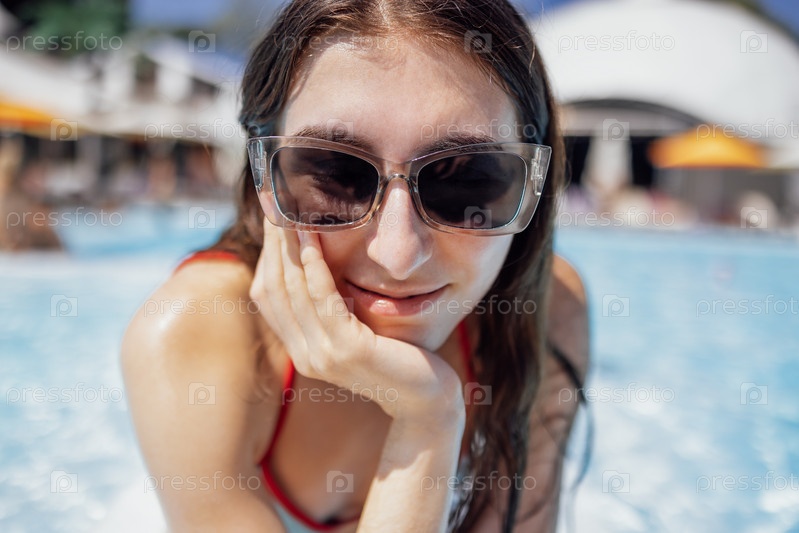 Крупным планом портрет привлекательной девушки-подростка в бассейне. Очаровательная девушка в солнечных очках и купальнике на отдыхе