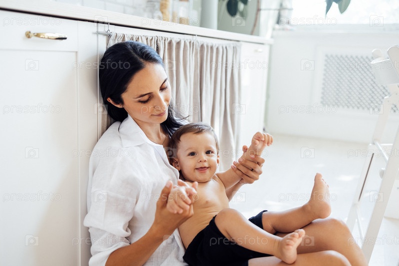 Молодая привлекательная женщина держит на руках улыбающегося сына
