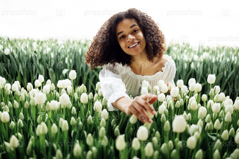 Женский портрет привлекательной темнокожей девушки, сидящей на тропинке среди тюльпанов в оранжерее
