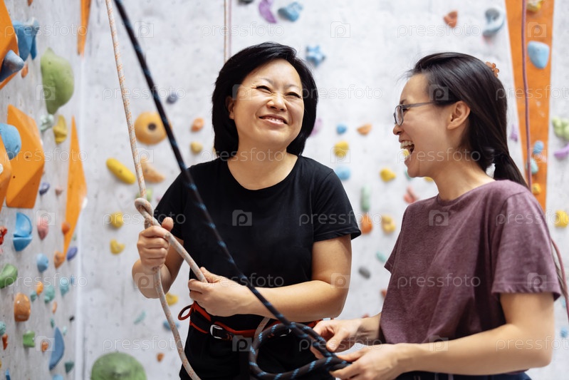 Улыбающиеся азиатские женщины в спортивной одежде позируют возле тренировочной стены по боулдерингу