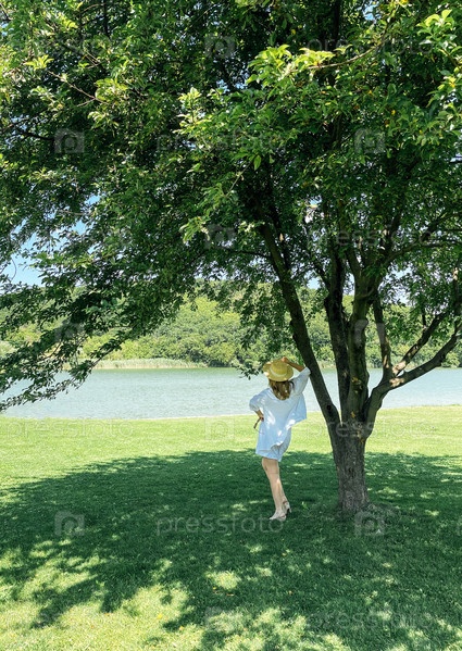 Молодая женщина в белой одежде и соломенной шляпе стоит возле раскинувшегося дерева и смотрит на реку или озеро