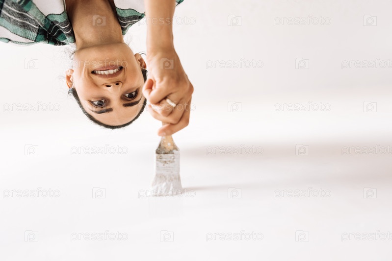 Молодая женщина в повседневной одежде красит стену дома в белый цвет. Вид снизу. Девушка держит кисть. Улыбающийся художник работает. Женщина наносит краску на внутреннюю стену дома