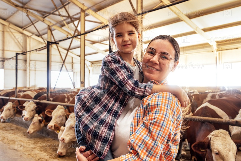 Молодая женщина в повседневной одежде держит на руках маленькую дочь в коровнике. Счастливая семья фермеров в сарае