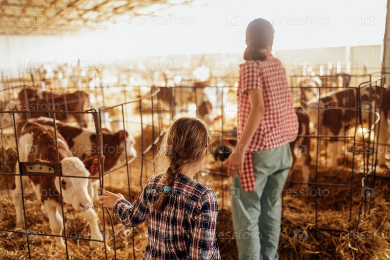 Маленькая девочка и ее сестра-подросток в повседневной одежде гладят телят в коровнике. Симпатичные дети заботятся о домашних животных на ферме в сельской местности. Вид сзади. Дочери фермера помогают по дому