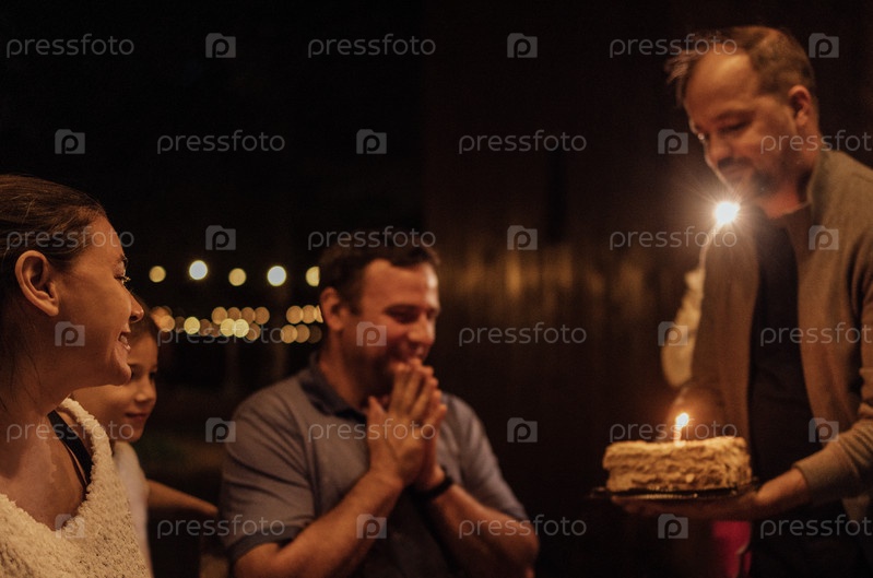 Молодой человек принимает поздравления с днем рождения от своей семьи. Друзья и близкие поздравляют юбиляра. Подруга несет имениннику торт со свечой
