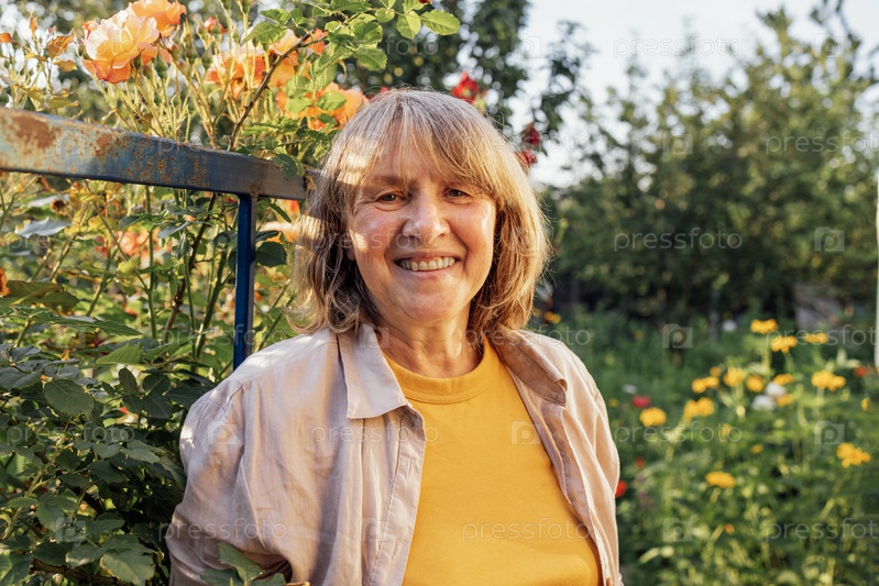 Крупным планом портрет улыбающейся зрелой женщины в повседневной одежде. Счастливый пенсионер в саду. Женщина средних лет на улице
