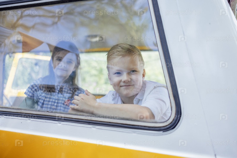 Симпатичный счастливый мальчик и девочка выглядывают из окна желто-белого ретро-минивэна