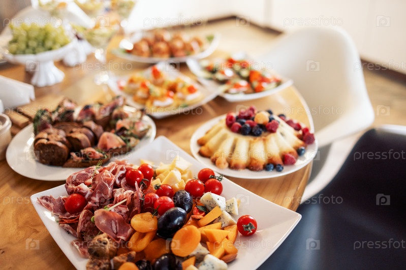 Крупный план вкусных закусок на деревянном столе в столовой дома. Вкусные сытные блюда. Нарезка колбасы и сыра с оливками и помидорами