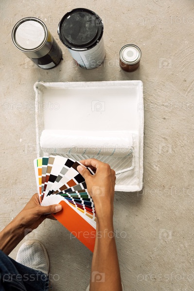 Крупный план женских рук, держащих палитру цветов и банки с краской с роликовой кистью. Молодая женщина выбирает цвет краски, используя образцы краски. Вид сверху