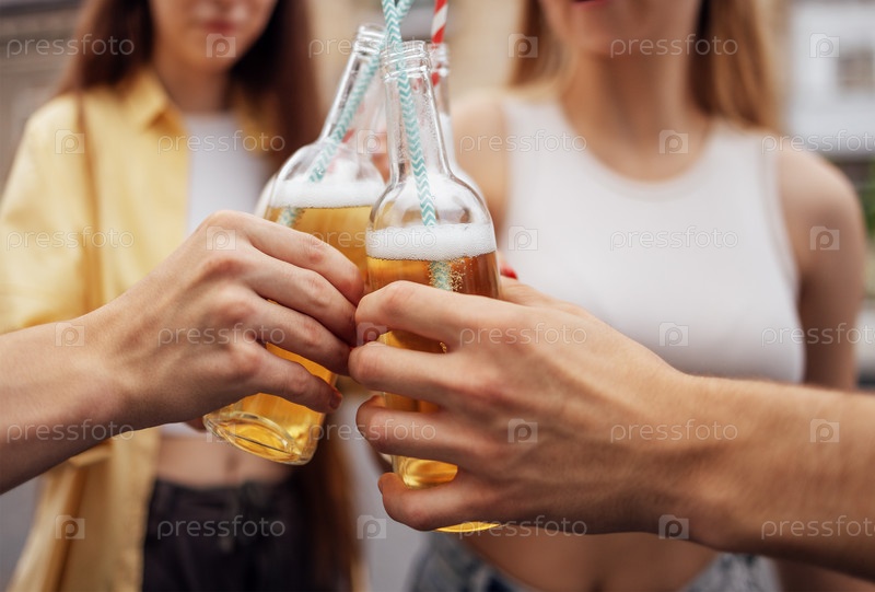 Группа подростков веселится и пьет лимонад на улице