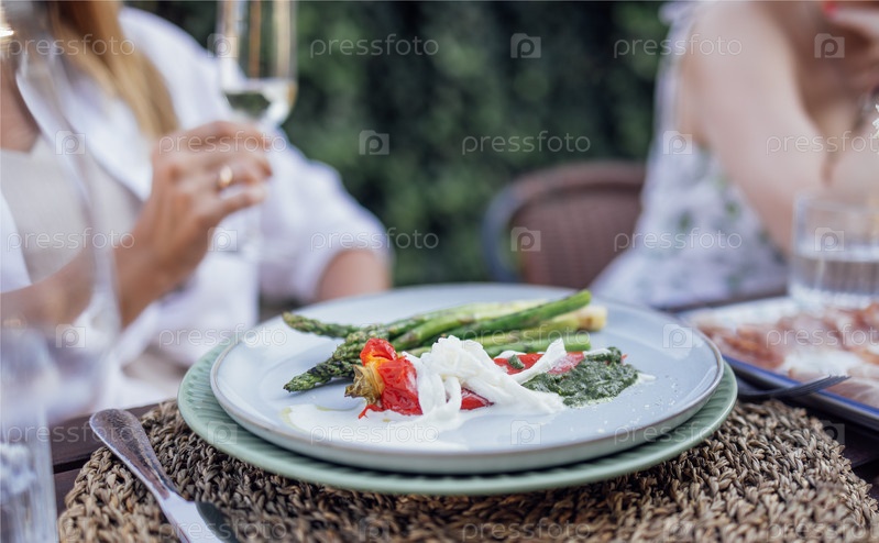 Крупный план вкусного блюда на открытом столе. Жареная спаржа с перцем и сметанным соусом. Вкусный перекус в ресторане