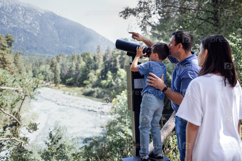 Отец и сын смотрят на горы и реку в бинокль с монетоприемником. Счастливая семья туристов наслаждается прекрасным пейзажем