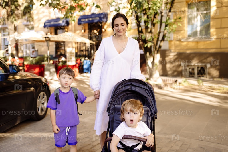 Беременная женщина в белом платье гуляет с двумя детьми по городу. Мама с коляской водит старшего ребенка за руку по улице