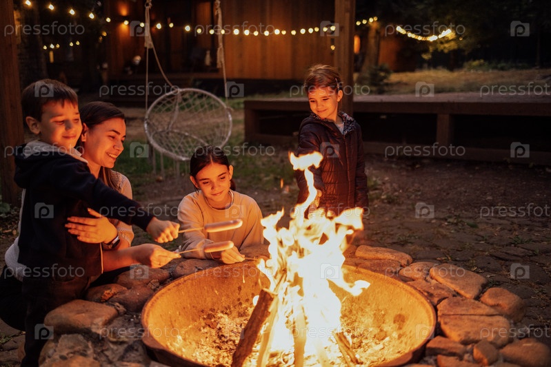 Молодая женщина с тремя детьми жарит на огне зефир. Привлекательная мама с сыном и дочерьми веселятся на заднем дворе